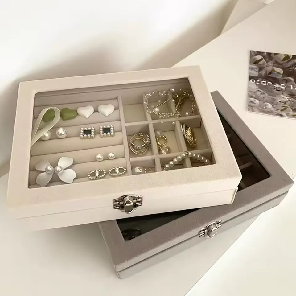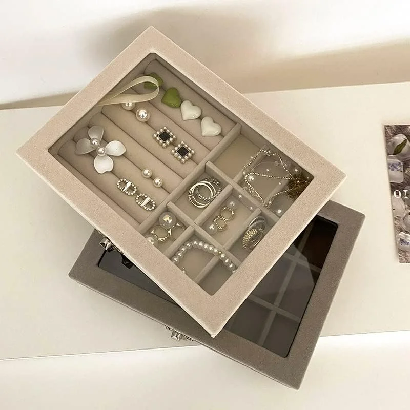 É hora de transformar a sua coleção de joias em uma obra de arte pessoal. A nossa **Caixa Organizadora de Joias** foi criada para quem valoriza a beleza nos mínimos detalhes, unindo um design sofisticado com a máxima praticidade. Feita com materiais de alta qualidade como vidro, pano flocado e placa de densidade, ela não é apenas um local de armazenamento, mas um display de elegância.